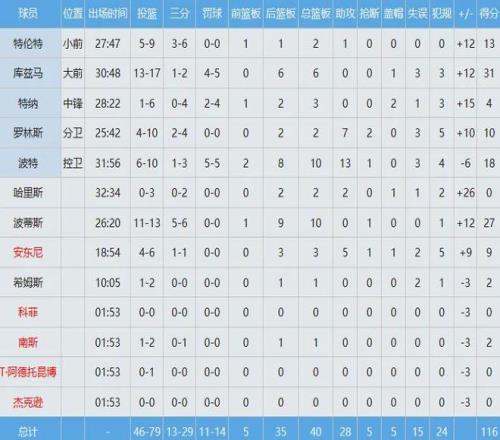 库兹马难得爆发,竟然投篮17中13,以高达约76%命中率轰下31分外加6板;小波特继续强力输出,独揽18分10板13助,三双到手。