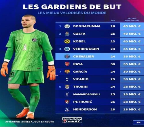 北京时间12月15日,在更新了法甲球员的身价之后,德转列出了目前世界足坛身价排名前10的门将,多纳鲁马4500万欧元第一,此次更新后身价下跌500万欧元的舍瓦利耶以3500万欧元并列第四。