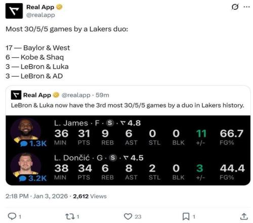 他与詹姆斯的进攻表现恰恰是湖人赢球的基本盘,本场是两人第三次同场轰下至少30+5+5表现,追平詹眉并列湖人队史第三,仅次于OK组合的6次与埃尔金贝勒和韦斯特的17次。