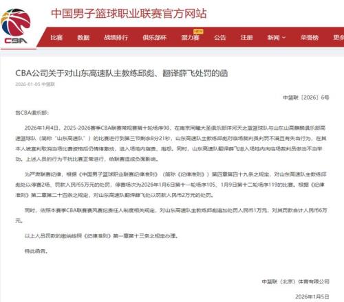 为严肃联赛纪律,根据《中国男子篮球职业联赛纪律准则》(简称《纪律准则》)第四章第四十九条之规定,对山东高速队主教练邱彪处以停赛2场、罚款人民币5万元的处罚,停赛场次为2026年1月6日第十一轮场序105、1月9日第十二轮场序119的比赛。根据《纪律准则》第二章第二十四条之规定,对山东高速队翻译薛飞处以罚款人民币2万元的处罚。