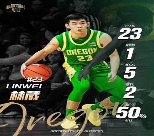 1月6日NCAA常规赛一场比赛,俄勒冈大学在客场加时以85-88惜败罗格斯大学,效力俄勒冈大学的后卫林葳首发出战,打出了来到NCAA赛场之后的最佳一战,全场出战33分钟,14投8中,三分12中6、罚球2中1,砍下23分1篮板5助攻2抢断,其中得分、出场时间、三分球等多项数据创个人NCAA生涯新高。