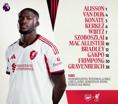 利物浦首发:1-阿利松、6-凯尔凯兹、4-范戴克、5-科纳特、12-康纳-布拉德利、38-赫拉芬贝赫、10-麦卡利斯特、8-索博斯洛伊、7-维尔茨、30-弗林蓬、18-加克波