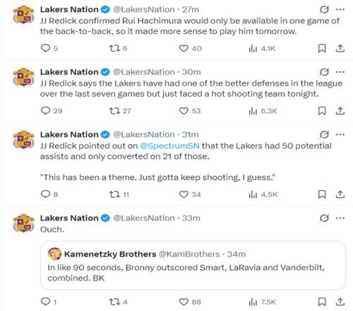 赛后湖人主帅雷迪克的采访这样说道:过去七场比赛我们的防守是联盟前列,但很可惜的是这场比赛我们遇上了手感火热的国王队。(雷迪克也透露八村垒背靠背只能出场一次,所以他会在明天对阵老鹰的比赛中复出)
