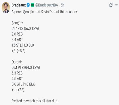 在火箭三连客吞下三连败后,杜兰特、申京两人都遭到了诸多的批判,不少的火箭球迷将球队的低迷归罪于这两位核心。火箭记者Bradeaux晒出杜兰特本赛季场均26.1+5.3+4.5+0.6+1的数据、申京场均21.7+9+6.4+1.5+1的数据力挺两人。