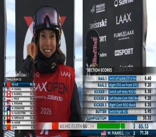 此次莱克斯站决赛只有两轮滑行机会,取成绩最高的一轮分数排名。谷爱凌在第一轮滑行中就拿到了85.13分,这一分数也是当日全场最高分。