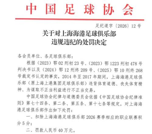 在新一年第一个月的最后几天,中国足坛发生了一件大事。16支中超球队里有9个被罚分,最多的10分,最少的5分,让接下去的2026赛季中超联赛冠军争夺,变得有些微妙。
