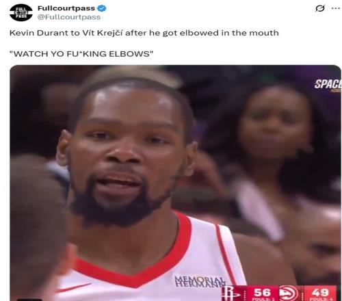 期间杜兰特对着克雷伊奇说道:“注意你的肘部”。
