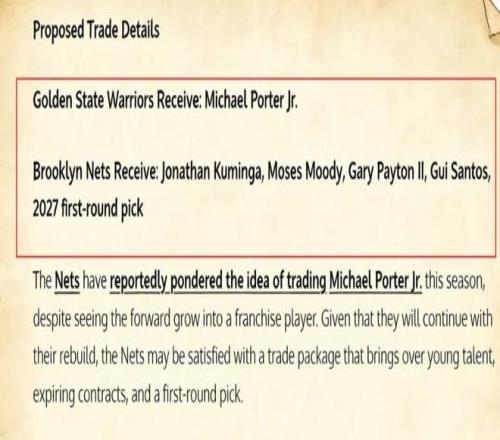 美媒《Fadeaway World》更是提出了一套5换1的交易方案,建议勇士打包送出穆迪、库明加、桑托斯、小佩顿以及2027年的首轮签,从篮网引入小波特。