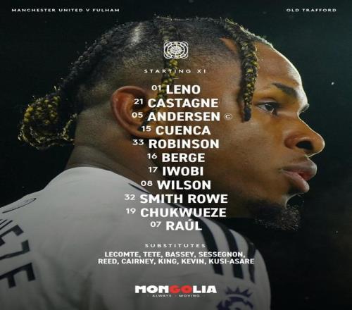 富勒姆首发:1-莱诺、21-卡斯塔涅、5-安诺生、15-昆卡、33-罗宾逊、16-贝格、17-伊沃比、8-哈里-威尔逊、32-史密斯-罗、19-丘库埃泽、7-劳尔-希门尼斯