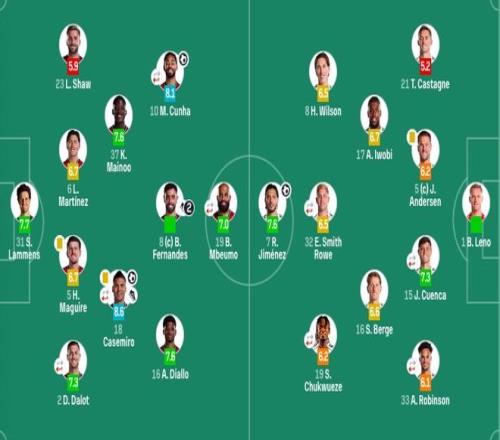 富勒姆首发:1-莱诺、21-卡斯塔涅、5-约阿希姆·安诺森、15-昆卡(86'3-巴锡)、33-罗宾逊(71'30-塞塞尼翁)、16-博格、17-伊沃比、8-哈里-威尔逊、32-史密斯-罗(71'22-凯文)、19-丘库埃泽(79'10-凯尔尼)、7-希门尼斯