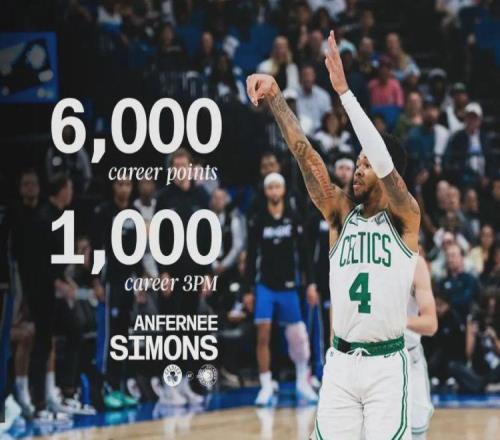 凯尔特人119-114战胜热火,完成19分大逆转。凯尔特人后卫安芬尼-西蒙斯替补出战34分钟,投篮28中13,三分16中7,罚球6中6,爆砍39分4篮板4助攻1抢断,正负值+18全场第二高!得分创造个人